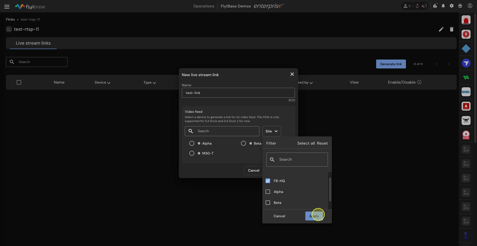 Enter a name for your link, choose the video feed device, and filter your selection based on your sites and devices.