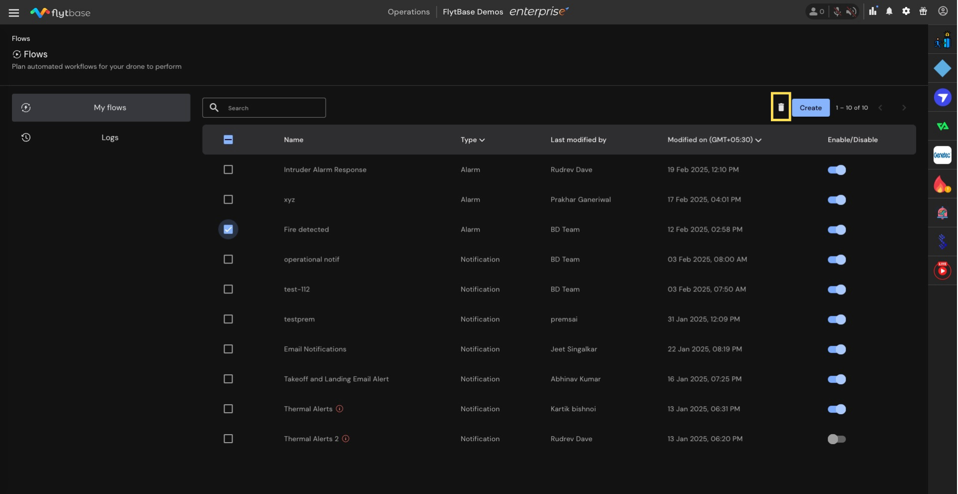* To **delete** a Flow, tick the checkbox next to the flow and click on![](https://1675645432-files.gitbook.io/~/files/v0/b/gitbook-x-prod.appspot.com/o/spaces%2FTfYUUwVnoRyxqEi8UiRV%2Fuploads%2FVII9RpDLhVC6gNJGJigK%2FDelete.svg?alt=media\&token=5e9d2986-42fc-47ad-a4b0-5edf6fbc744f). Confirm the deletion on the prompt that appears.
