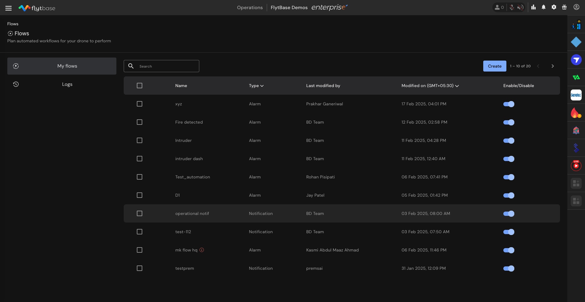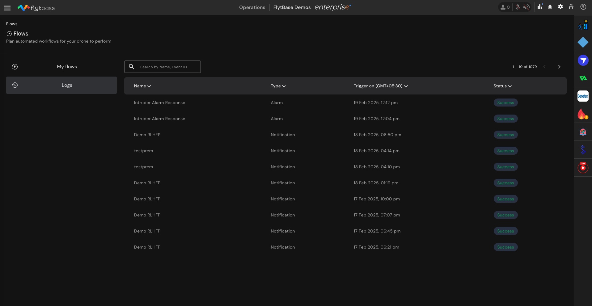 **Flows** in FlytBase is a dynamic feature designed to streamline operational efficiency by configuring the drone's response to specific alarm triggers or operational notifications. These workflows allow for the deployment of drones in response to various alarm sources, with the option for missions to be approved manually or carried out automatically for repetitive events. They also allow selected organisation members to keep track of the drone operations by staying notified through emails or SMS.&#x20;