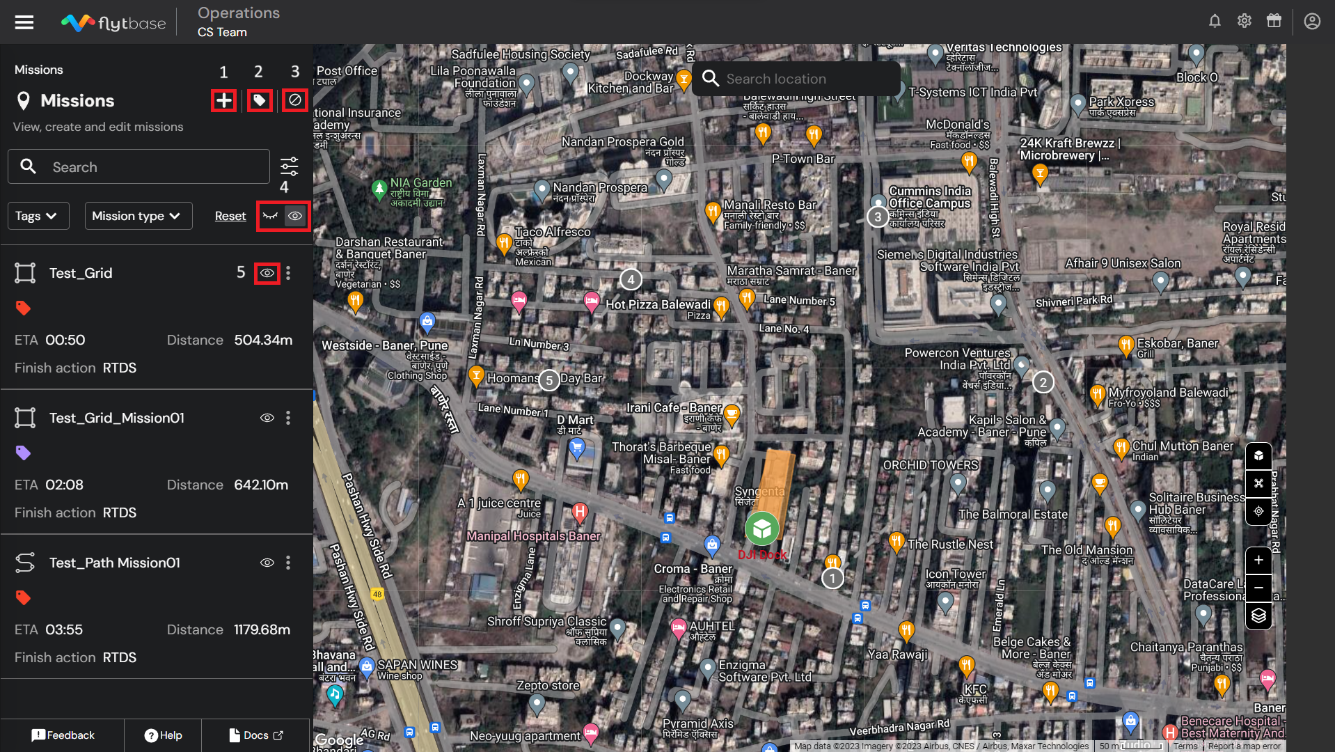 5. **Hide**<picture><source srcset="https://1675645432-files.gitbook.io/~/files/v0/b/gitbook-x-prod.appspot.com/o/spaces%2FTfYUUwVnoRyxqEi8UiRV%2Fuploads%2F9HnujYOvAcK6KOfE5lQM%2FVector.png?alt=media&#x26;token=ff727317-e074-456f-8848-beb0ceaae9f8" media="(prefers-color-scheme: dark)"><img src="https://1675645432-files.gitbook.io/~/files/v0/b/gitbook-x-prod.appspot.com/o/spaces%2FTfYUUwVnoRyxqEi8UiRV%2Fuploads%2FBlek7zXLVyA81R9p3ZwW%2FHIDE.png?alt=media&#x26;token=34aa8e0b-8863-4806-88f3-7a3859d553be" alt=""></picture>**/Show**<picture><source srcset="https://1675645432-files.gitbook.io/~/files/v0/b/gitbook-x-prod.appspot.com/o/spaces%2FTfYUUwVnoRyxqEi8UiRV%2Fuploads%2FO3FojQh3zX19cju0kgCc%2FVector%20(1).png?alt=media&#x26;token=93e79065-f713-4bff-9648-6ccb81debca4" media="(prefers-color-scheme: dark)"><img src="https://1675645432-files.gitbook.io/~/files/v0/b/gitbook-x-prod.appspot.com/o/spaces%2FTfYUUwVnoRyxqEi8UiRV%2Fuploads%2FFmeOcA0D5rfr5SgUtWE1%2FSHOW.png?alt=media&#x26;token=b97f6bec-6e8b-470d-8e05-ef3ae1bcd022" alt=""></picture> **Single Mission:** Provides control to hide or show a particular mission on the map.&#x20;
