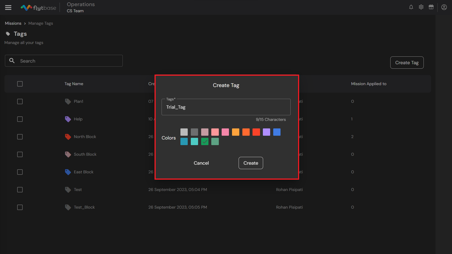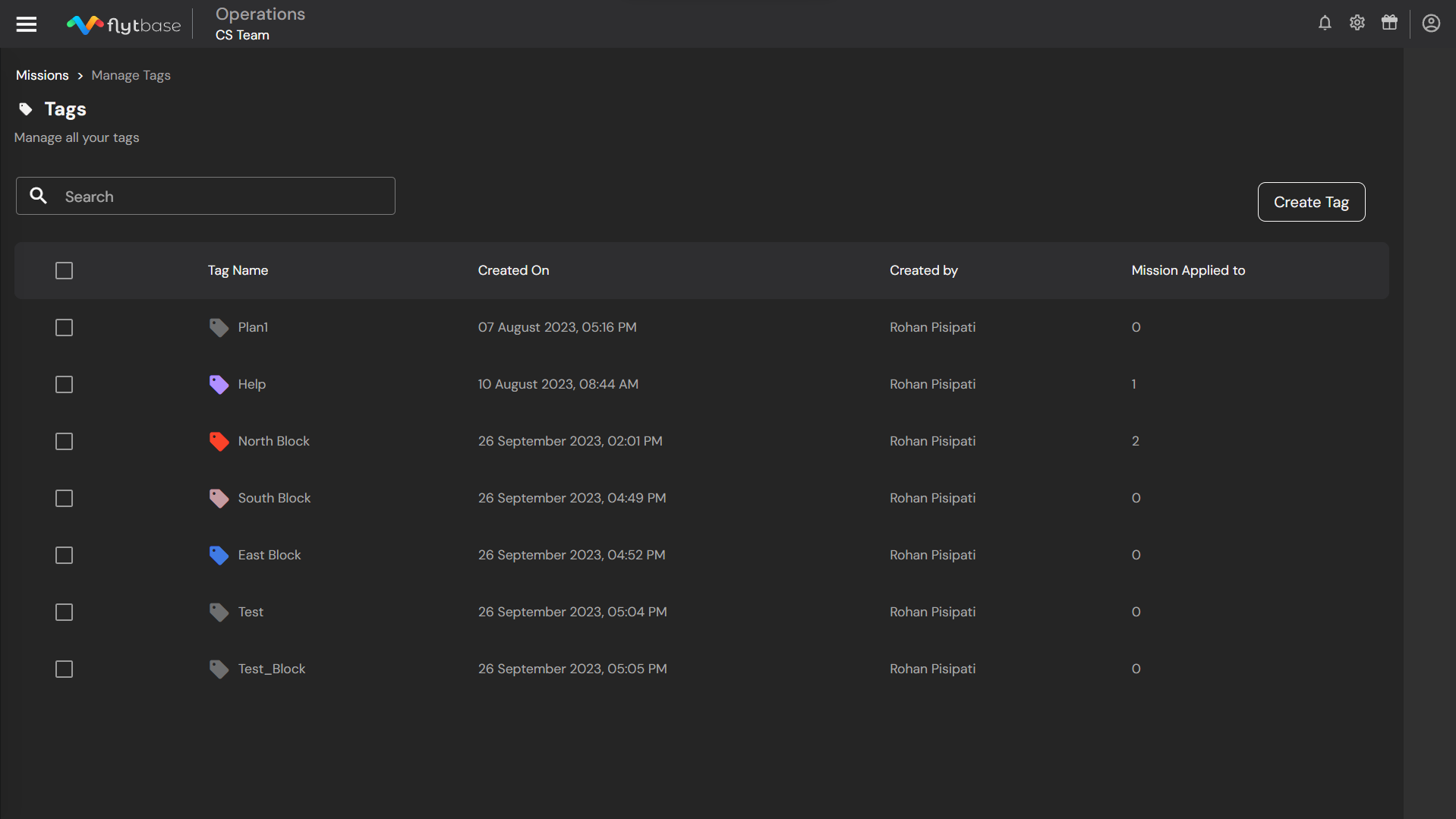 The newly created tags will be visible under the Manage Tags section. Operators can assign multiple tags to a single mission.&#x20;